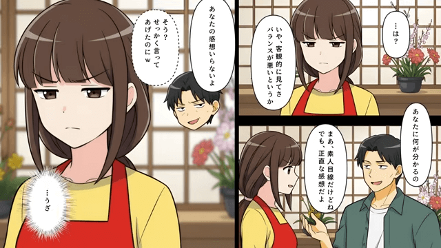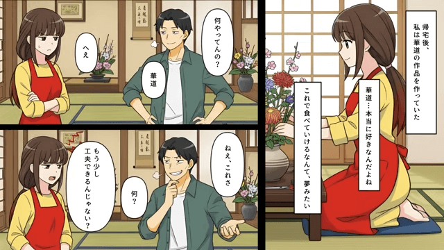 今回は『夫と離婚が成立した途端「これからもよろしく(笑)」私「は?」⇒帰ってきた夫の末路』を紹介します。 華道の作品が話題になっている主人公に、友人は「収入も増えてるんじゃない?」と尋ねました。 すると主人公は、もう夫の収入がなくても生きていけるほど稼いでいることを明かして…。