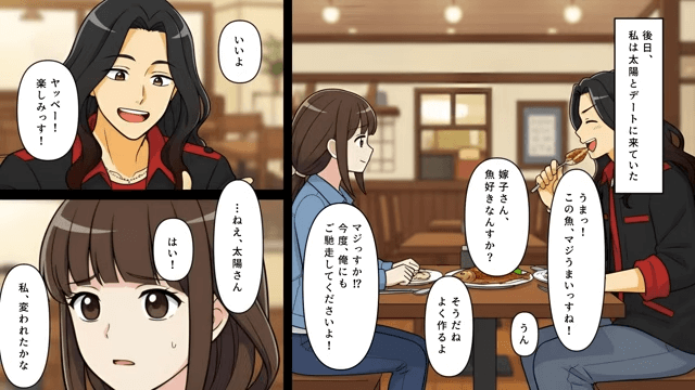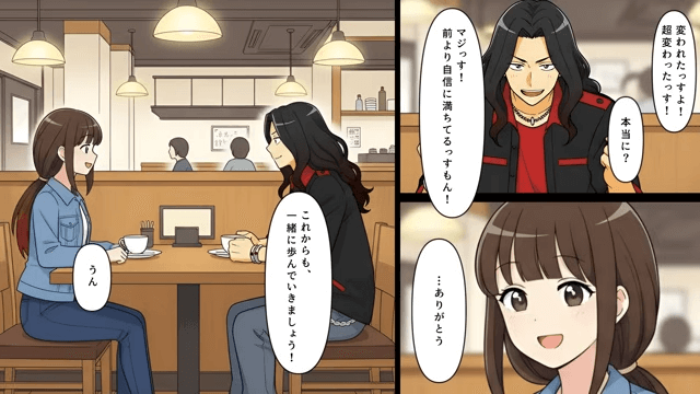 生徒とデートに来ていた主人公は「私、変われたかな」と生徒に尋ねます。 すると生徒は「変われたっすよ!」とうなずき、前よりも自信に満ちていると言ってくれたのでした。