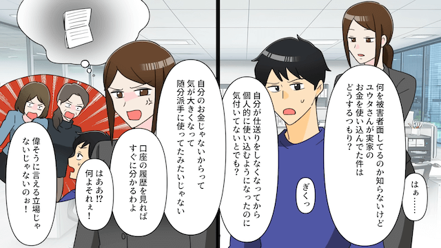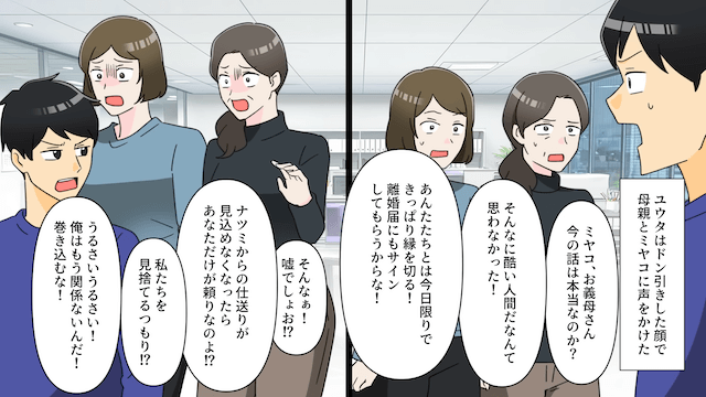 父が主人公の味方をすると、母は「この子の言い分を一方的に信じるなんておかしな話じゃない!?」と言い、主人公より妹のほうがかわいい娘だと主張しました。 その発言に激怒した父が母と妹の過去の悪事を暴露すると、義弟は2人に呆れ、離婚と絶縁を宣言します。