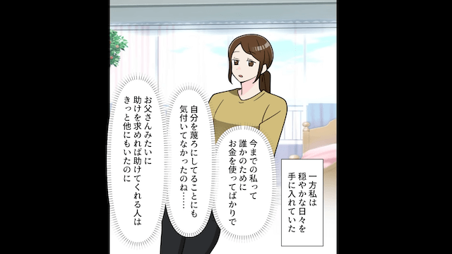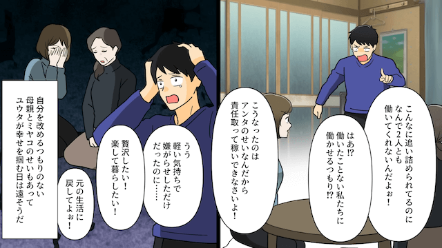 主人公が母と妹を突き放すと、2人は義弟に狙いを定め、逃げる義弟を追いかけてどこかへ行ってしまいました。 その後、母たちは何度か主人公に接触しようとしてきましたが、父が法的な処分を下したことで苦しい生活を送ることに。