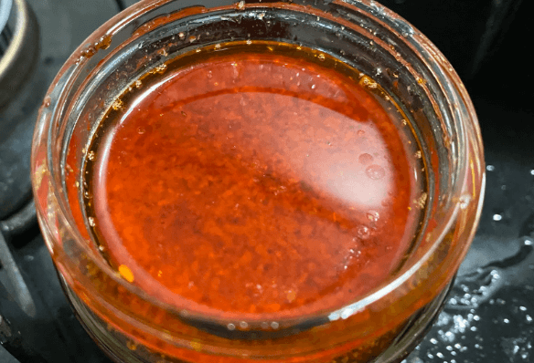 (3)たれ作り 容器に、茹で汁以外の材料をすべて混ぜ合わせます。 花椒辣醤の刺激、酢の鋭さ、ニンニクの力強さ。 袋に残った茹で汁は、電子レンジで一度沸騰させてから加えます。