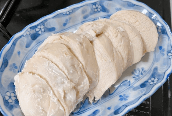 しっとり仕上がった鶏ハムを、食べやすい太さにカットします。