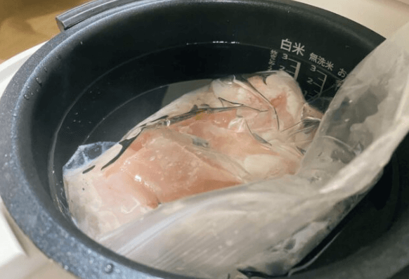 (2)加熱 炊飯器に肉を入れ、沸騰したての熱湯を注ぎます。 すぐに蓋を閉め、「保温モード」で1時間放置。 低温に次の一手を考える時間です。 炊飯器がじっくりと仕事をこなす間、あなたは温かい飲み物でも飲んで、ただ息を整えてください。