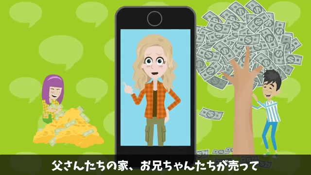 本当に両親が家を建てたのだと知り、義姉は「嘘…」と焦ります。 そして、これはまずいと思った主人公は、兄たちが家を売ろうとしていることを父に報告しました。