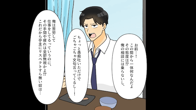今回は『高熱の私を見下す夫「俺のメシまだ?」私「高熱で動けなくて」→別室に義母がいた結果』を紹介します。 悩みを鼻で笑われた翌日、反撃として夫に冷たく接し始めた主人公。 そして別の日、帰宅した夫が仕事の愚痴を言うと…。