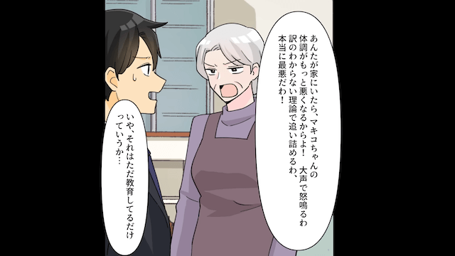 主人公が帰宅した夫に体調が悪いことを伝えると、夫は「そんなの知らねぇよ!きちんと管理をしてなかったお前の自業自得だろ!?」と責めてきました。 すると別室にいた義母がやってきて、夫に激怒したのです。