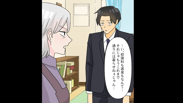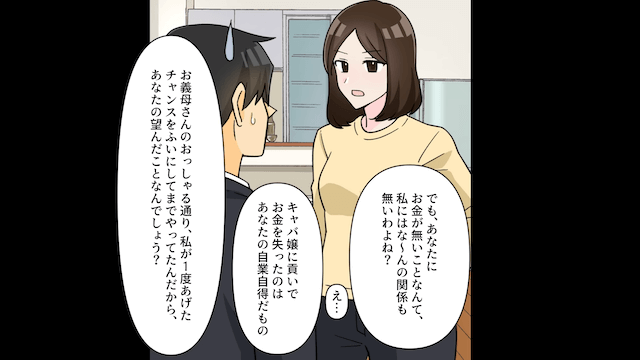 主人公が夫に離婚を突きつけて慰謝料を請求すると、浮気相手に貢いでいた夫は「それは勘弁してくれないか!?俺、今ちょっと金なくて…」と言いました。 しかし主人公は「私にはなんの関係もないわよね?」と突き放し、夫が使い込んだ共有貯金の返金も求めたのです。