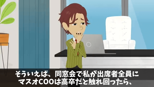 同級生は、主人公のことを高卒だと触れ回ったときにほかの同級生たちが引いていた理由をようやく理解しました。 そしてその話を聞いた社長は絶句したのです。