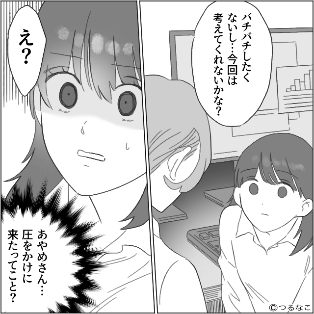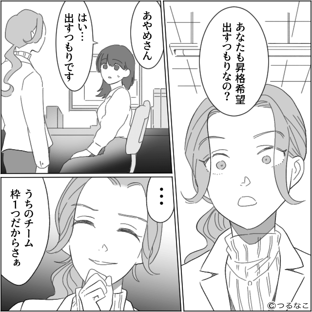 主人公が「はい」と答えると、同僚は「枠1つだからさぁ、今回は考えてくれないかな?」と圧をかけてきて…。