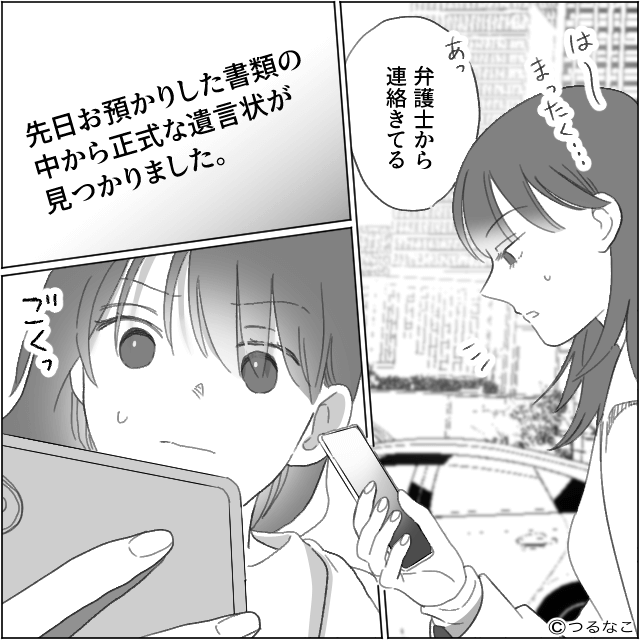ママ友はなにも言い返せず、その様子を見た主人公は「名誉毀損もプライバシー侵害も立派な罪ですから!」と告げてその場を去りました。 その後、スマホを見た主人公は「遺言状が見つかりました」と弁護士から連絡が来ていることに気づきます。