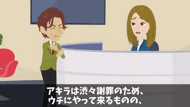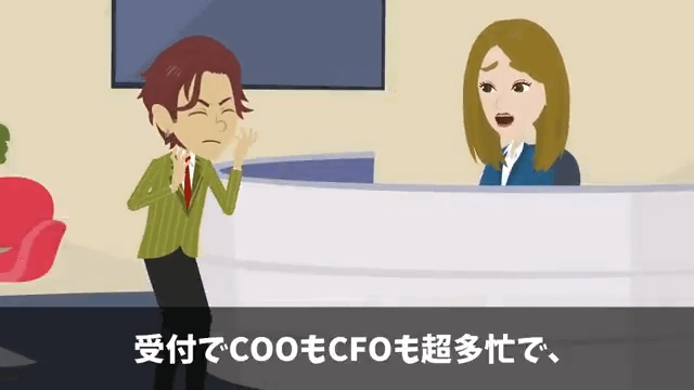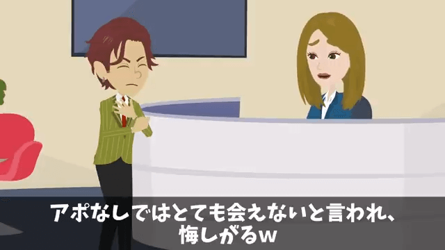 社長たちは同級生に、主人公と婚約者に謝罪をするため、再度外資系企業に行くよう命じました。 そして同級生は外資系企業に向かったのですが、受付でアポがないと会えないと言われてしまい…。