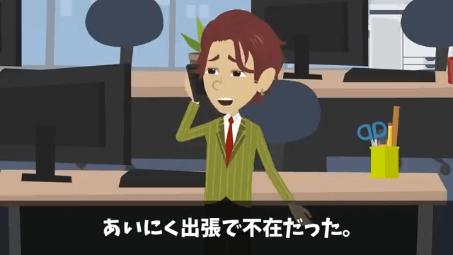 主人公は土下座をしている同級生に、もう一度担当者にアポを取るよう伝えました。 その後、同級生は担当者にアポを取ろうとしましたが、担当者は出張中で…。
