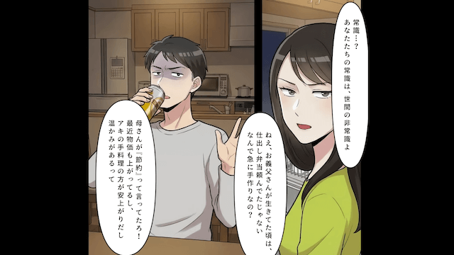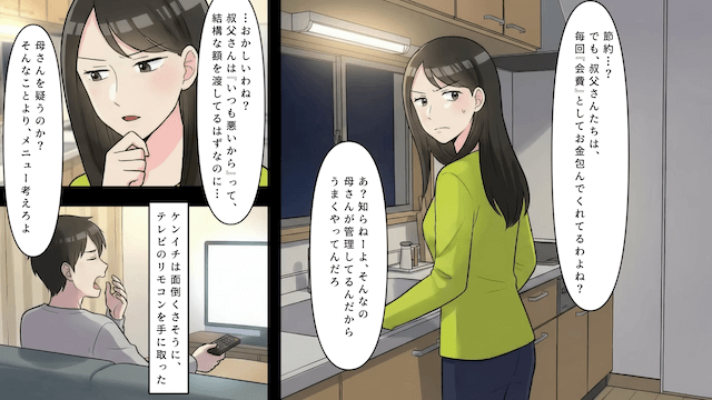 そんな扱いにうんざりした主人公は、親戚たちからお金をもらっているにもかかわらず、主人公の手料理で節約しようとする義母に違和感を抱き…。