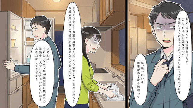 主人公が親戚の集まりに行けないと断るも、話を聞かずに料理をお願いしてくる義母。 さらに夫も主人公を見下し「嫁の務めだろ?」と責めてきたのです。