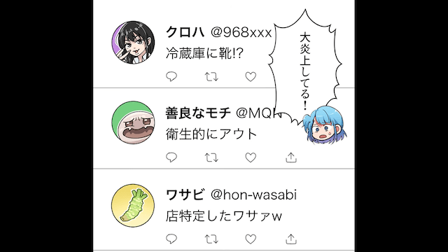 料理長にうんざりしながらも、意地になって仕事を頑張っていた主人公。 そんなある日、冷蔵庫で主人公の靴を冷やしている写真がSNSに投稿され、店が大炎上したのです。
