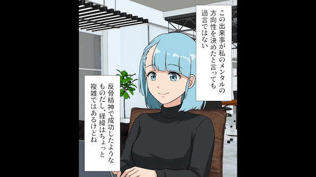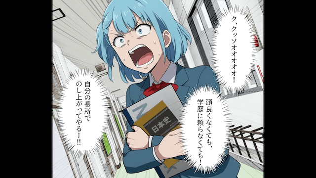 高校時代、頭がいい同級生に嫌がらせをされていた主人公。 そのとき、学歴に頼らず自分の長所でのしあがると決めた主人公は、反骨精神で成功を掴んだのです。