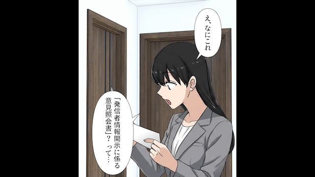 あるとき、主人公に関する嘘の記事がネットで拡散され、同級生を疑い始めた主人公。 しかし証拠がないため、開示請求をすることに決めました。
