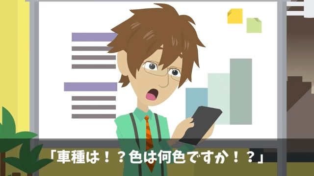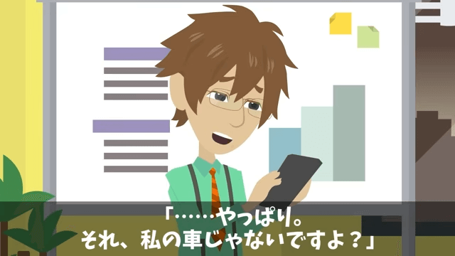 事故の報告に留まらず、所長は意気揚々とその車の特徴を詳しく説明し始めます。しかし、その内容を聞けば聞くほど主人公の確信は深まり、「……やっぱり。それ、私の車じゃないですよ?」と一喝。