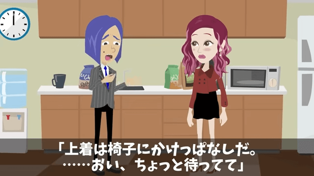 所長は主人公がトイレに行った隙に、主人公の上着を勝手に調べ始めました。 そして所長が「…へへっ、あった」と言うと、女性社員は「キャッ!所長ぉ、それって…」と言って…。