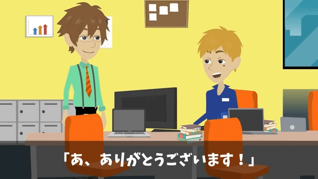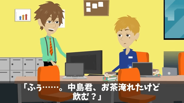 主人公の車に勝手に乗り込んだ所長は「荒い運転でガソリン空っぽにして返してやるわ!」と言いました。 一方、主人公は男性社員にお茶を勧めていて…。