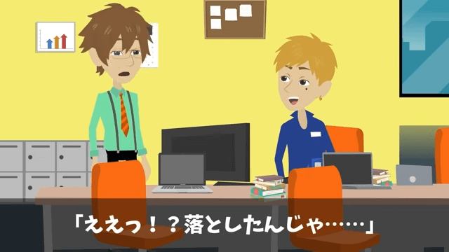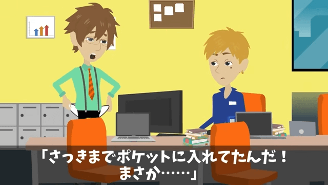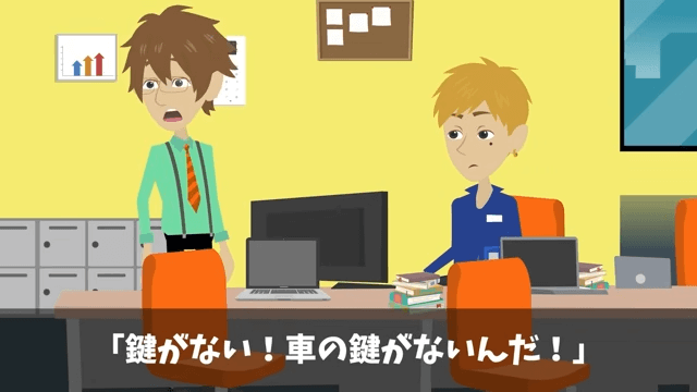 男性社員との談笑中、主人公は車の鍵がなくなっていることに気がつきました。 そして男性社員に「ええっ!?落としたんじゃ…」と言われた主人公は、先ほどまでポケットに入れていたことを話して…。