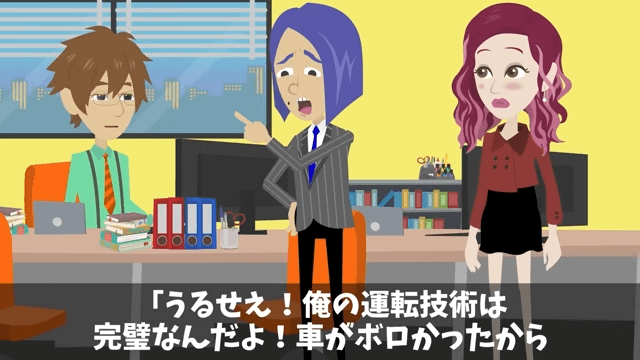 今回は『上司「お前に5年前に借りた車、事故ったから返す!」俺「それレンタカーだけど?」』を紹介します。 事故を起こした翌日、所長は「あー…首が痛ぇ。いててて」と言いました。 すると女性社員が「所長ぉ、大丈夫ですかぁ?湿布貼りましょうかぁ?」と声をかけて…。