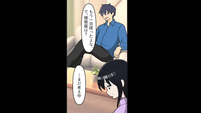 友人は「なにか裏があるはずよ」と言い、主人公が離婚届にサインをするのを止めてきました。 しかし夫は主人公にサインを催促し「お前に拒否権ないから」と言ってきたのです。
