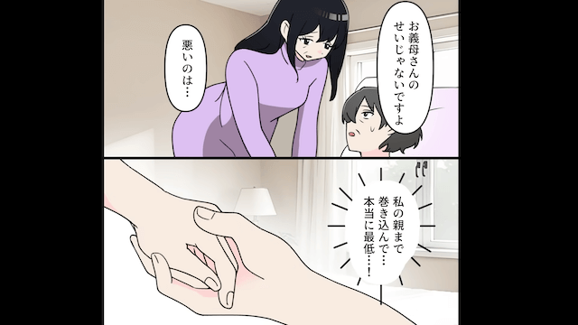 夫は主人公に「今週中にサインしろ。しなかったらお前の親に毎日電話するからな」と脅してきました。 そして夫の怒鳴り声を聞いた義母は、主人公に「ごめんね、私のせいで…」と謝ったのです。