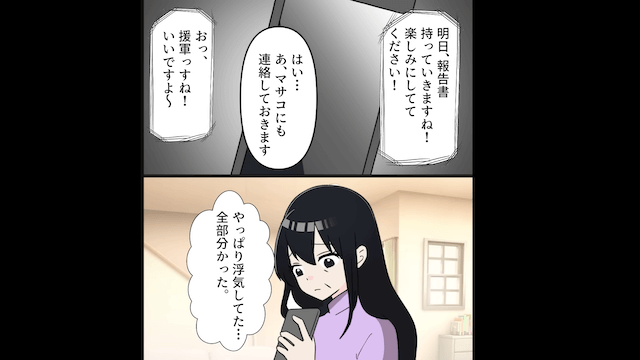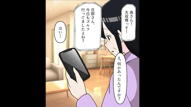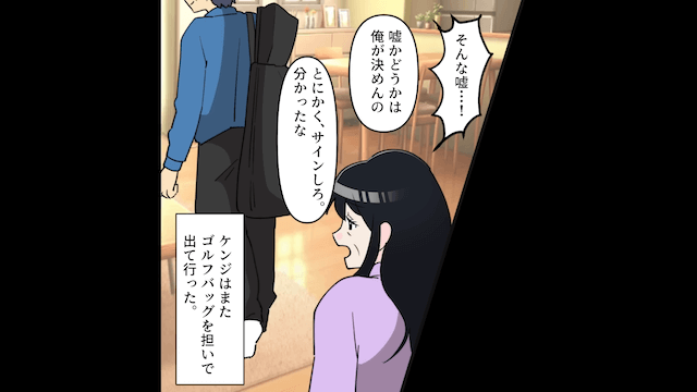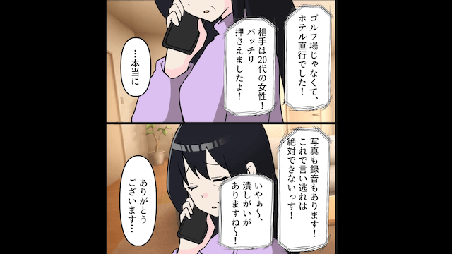 夫は「弁護士とか行ってねーよな?行ってたら許さねーからな」と主人公を脅し、そのままゴルフバッグを持って出かけてしまいました。 するとその直後、探偵から主人公のもとに電話がかかってきて、浮気の証拠が集まったことを知らされたのです。