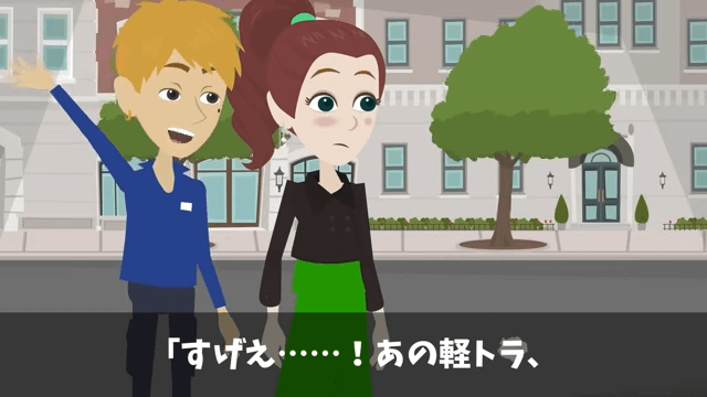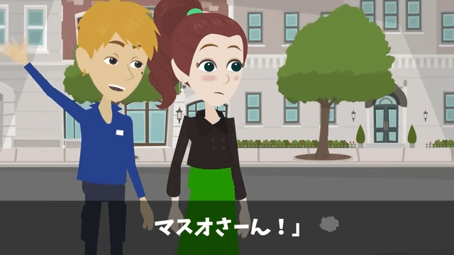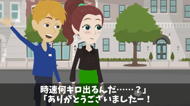 男性社員たちに別れを告げ、自分の車を運転して去っていった主人公。 そして男性社員は「ありがとうございましたー!」と言いながら、主人公に手を振ったのでした。