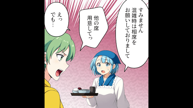混雑していたため主人公は相席をお願いしたのですが、女性客は「他の席用意して」とわがままを言ってきて…。
