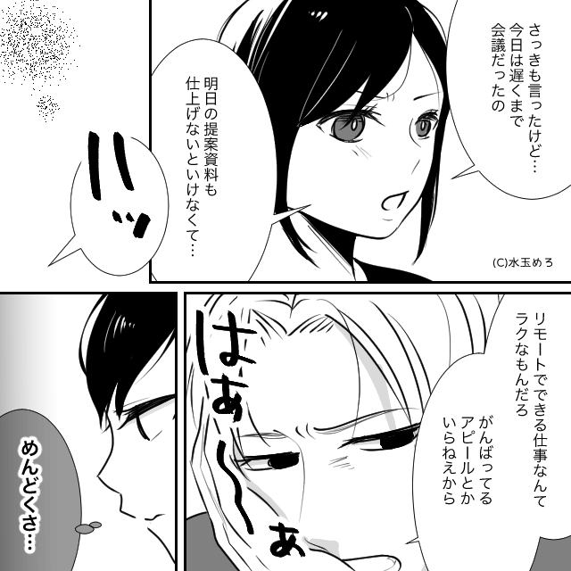 大手企業の営業部で働き、家でも仕事をしている主人公。 しかし夫は在宅ワークに理解がなく、見下してきます。