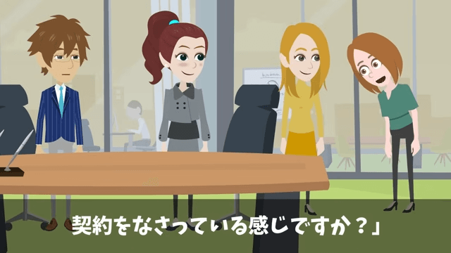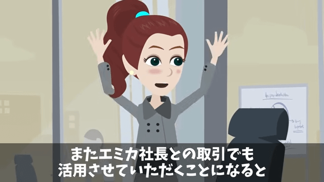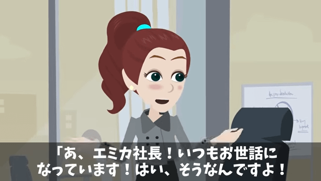 主人公たちが話をしていると、そこに別の会社の社長がやってきました。 すると取引先の社長が「いつもお世話になっています!」と挨拶し、主人公の特許技術をこれからの取引でも活用すると話して…。