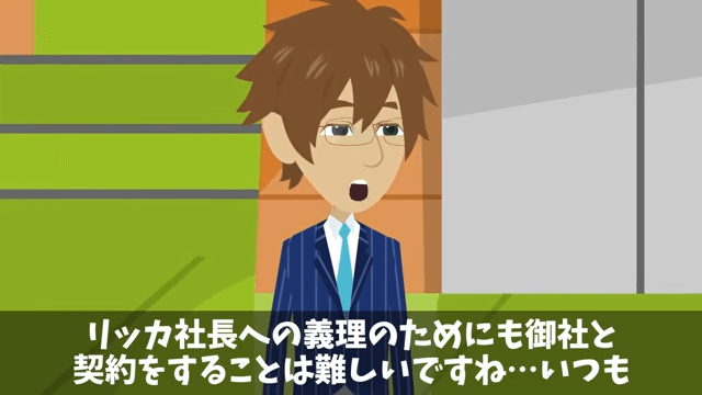 ライバル会社の専務は、主人公と契約できるまで諦める気はないと言います。 しかし主人公は、取引先の社長との義理があるからライバル会社とは契約できないと伝えました。