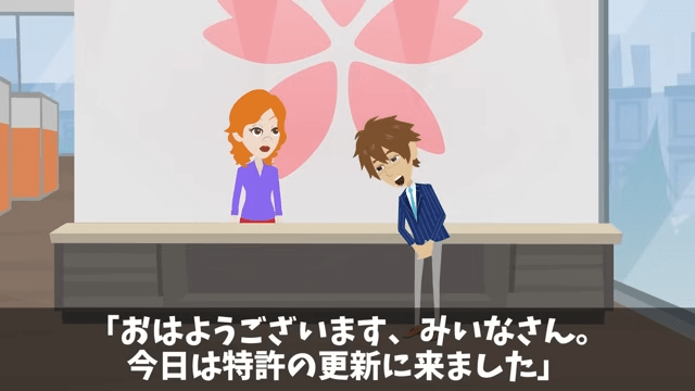 主人公は取引先の女性社員に特許の更新に来たことを伝えました。 すると取引先の女性社員は社長たちが外出中のため、ほかの者が対応すると主人公に説明して…。