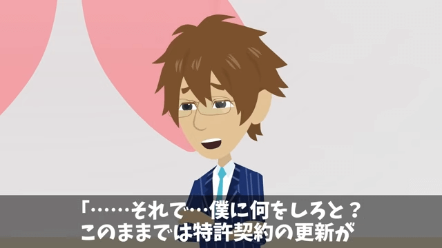 主人公は、このままでは特許契約の更新ができないことを取引先の女性社員に伝えます。 すると取引先の女性社員は、それなら契約を終了するしかないと言い出して…。