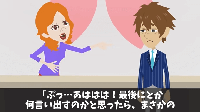 主人公は「このような決断をして弊社との契約を切ること、後悔なさいませんね?」と取引先の女性社員に確認します。 すると取引先の女性社員は「まさかの負け惜しみ!」と笑い始めて…。