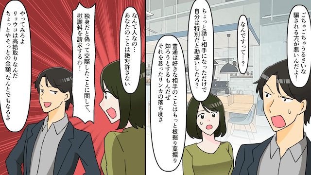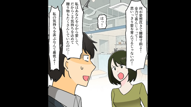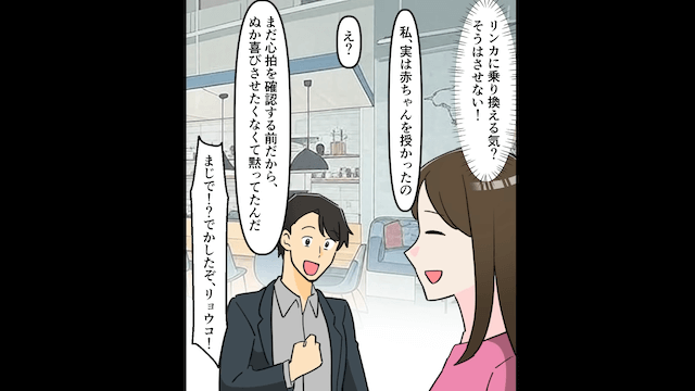 幼なじみに既婚者だとバレて焦った夫は「彼女には愛想も尽きて離婚寸前さ」と言い、幼なじみに乗り換えようとしました。 しかし主人公の妊娠を知った夫は喜び、幼なじみに「だまされるほうが悪いんだよ!」と言い放ったのです。