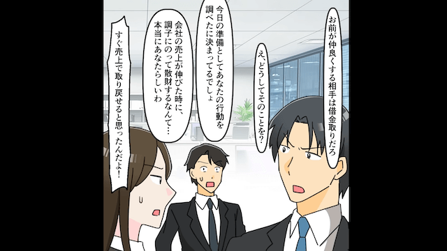 今回は『親友「彼氏を紹介するね!」私「私の夫だけど?」直後⇒夫がガクガクと震えだして…』を紹介します。 主人公たちに詐欺罪だと責められて会社経営を諦めた夫は、生活のために主人公に復縁を迫りました。 しかし主人公はそれを拒否し、話を聞いていた同僚が夫に「これ以上俺の愛する人を貶めないでくれ!」と言い出して…。