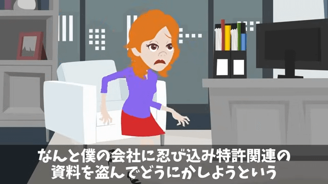 取引先の女性社員は強制的に会社に連れ戻され、謹慎処分が下されました。 その後、取引先の女性社員は主人公の会社に忍び込んで特許関連の資料を盗もうとしたのですが、すぐに見つかってしまい…。