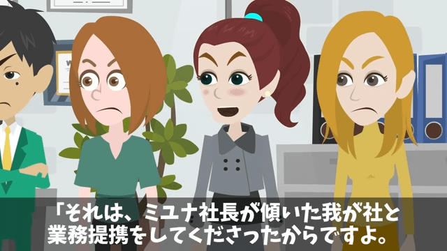 取引先の女性社員は、主人公だけでなく各社の社長たちが集まっていることに驚きました。 そこで取引先の社長は、ライバル会社と業務提携の契約を結ぶために集まったことを明かしたのです。