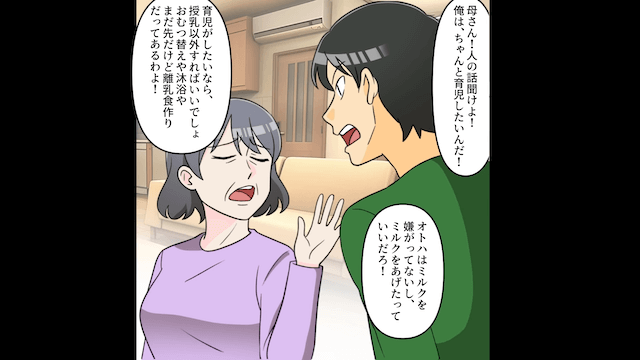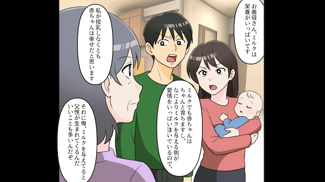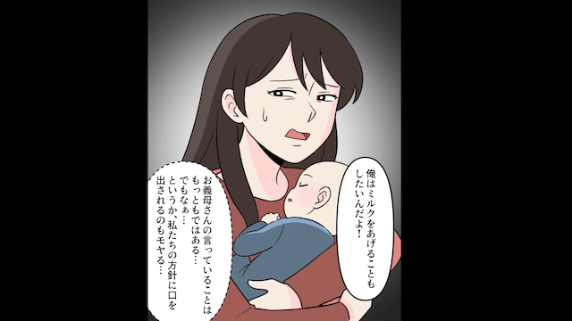 義母に「完母なの?」と聞かれた主人公は「基本的に授乳していますが、夫にお願いするときはミルクです」と答えました。 すると義母は「ちゃんとあげなさい!」と怒り、夫が反論しても意見を変えず…。