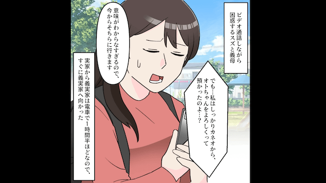義母に「うちは託児所じゃないのよ!?」と怒られた主人公は困惑し、ビデオ通話にして娘の姿を映しました。 すると義母の隣にも娘によく似た女の子がいて、驚愕した主人公は慌てて義実家へと向かったのです。