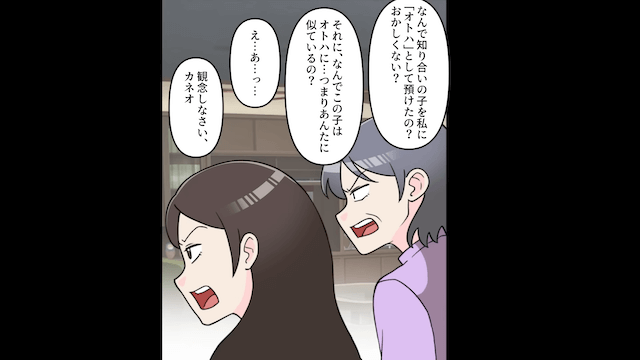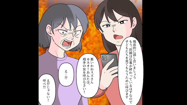 主人公と義母が夫を呼び出して問い詰めると、女の子も夫の子だと判明しました。 そして激怒した主人公は両親を呼び、義母は夫に浮気相手を呼ぶよう命じたのです。