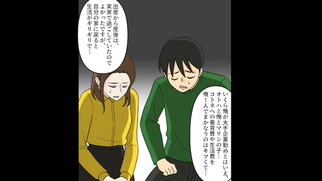 主人公と義母が説明を求めると、夫は浮気相手と2年前に出会い、妊娠は主人公とほぼ同時期だったことを明かしました。 そして義母に女の子の世話を押しつけた理由は、経済的に困窮したからだと話し…。