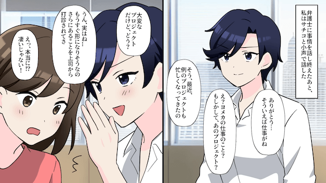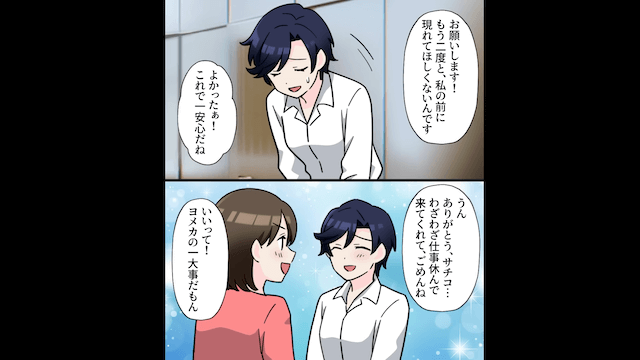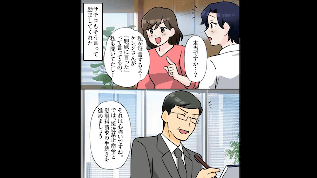 元夫の言動に危機感を抱いた主人公は弁護士に相談し、接近禁止命令と慰謝料請求の手続きを進めてもらうことにしました。 そして主人公は、仕事がうまくいっていて経済的に心配がないことを友人に伝え…。