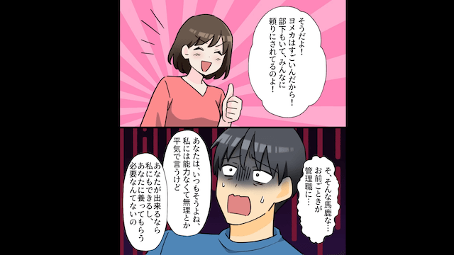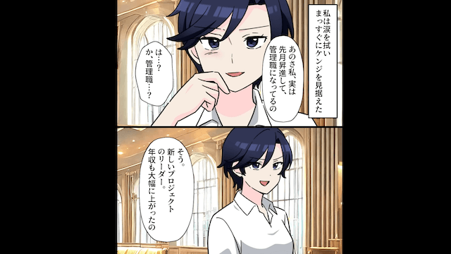 すると焦った元夫は経済力を盾に復縁を求めてきたのですが、主人公は管理職になったことを伝えて…。