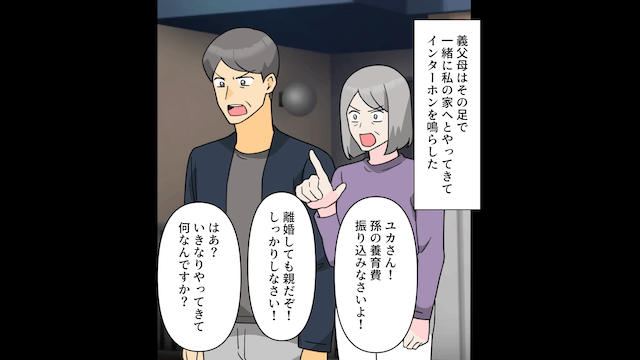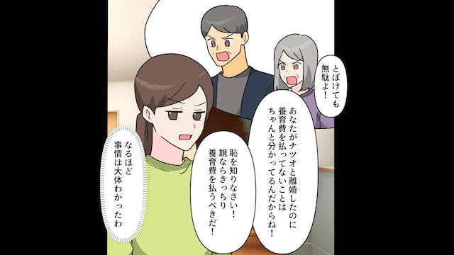 夫は義母に離婚したことを報告し、親権を手に入れたものの主人公が養育費を払わなくて金欠になっていると嘘をつきました。 すると夫の話を信じた義両親が主人公を一方的に責めてきたため、事情を察した主人公は現実を突きつけることにして…。