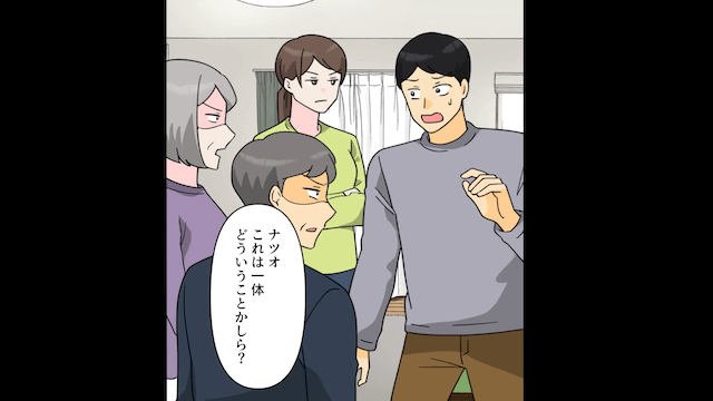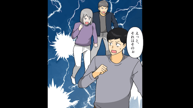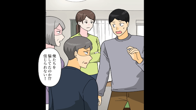 主人公が娘を抱いて玄関を開けると、義両親は驚愕し、夫の嘘に気づきました。 そのとき、慌てた様子の夫が家に入ってきたため、義両親は夫を問い詰めて…。