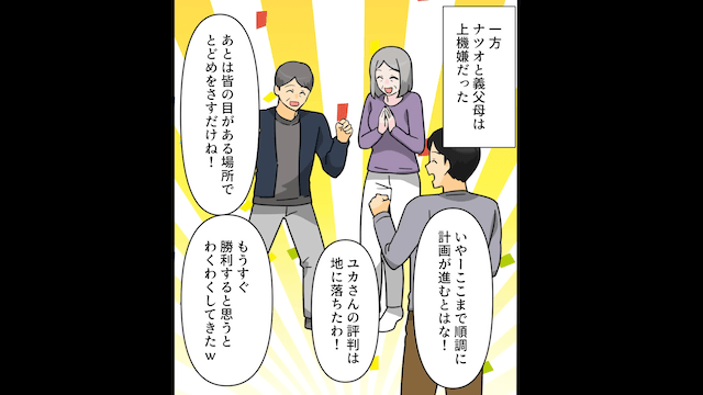 一方、夫と義両親は主人公への嫌がらせがうまくいったと喜び、義父がさらにアイディアを出して…。